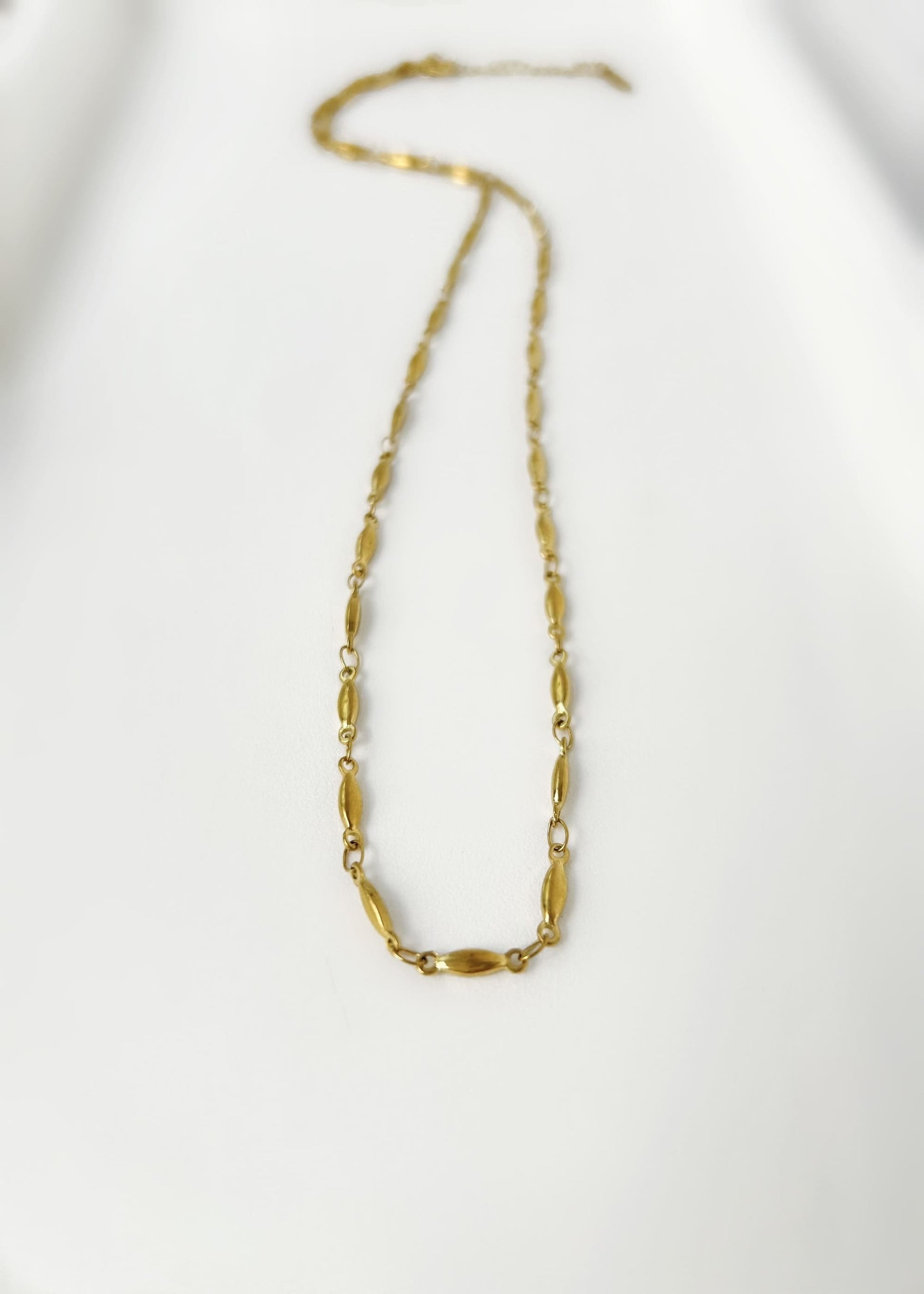 Cadena de acero dorado con eslabón de forma ovalada.