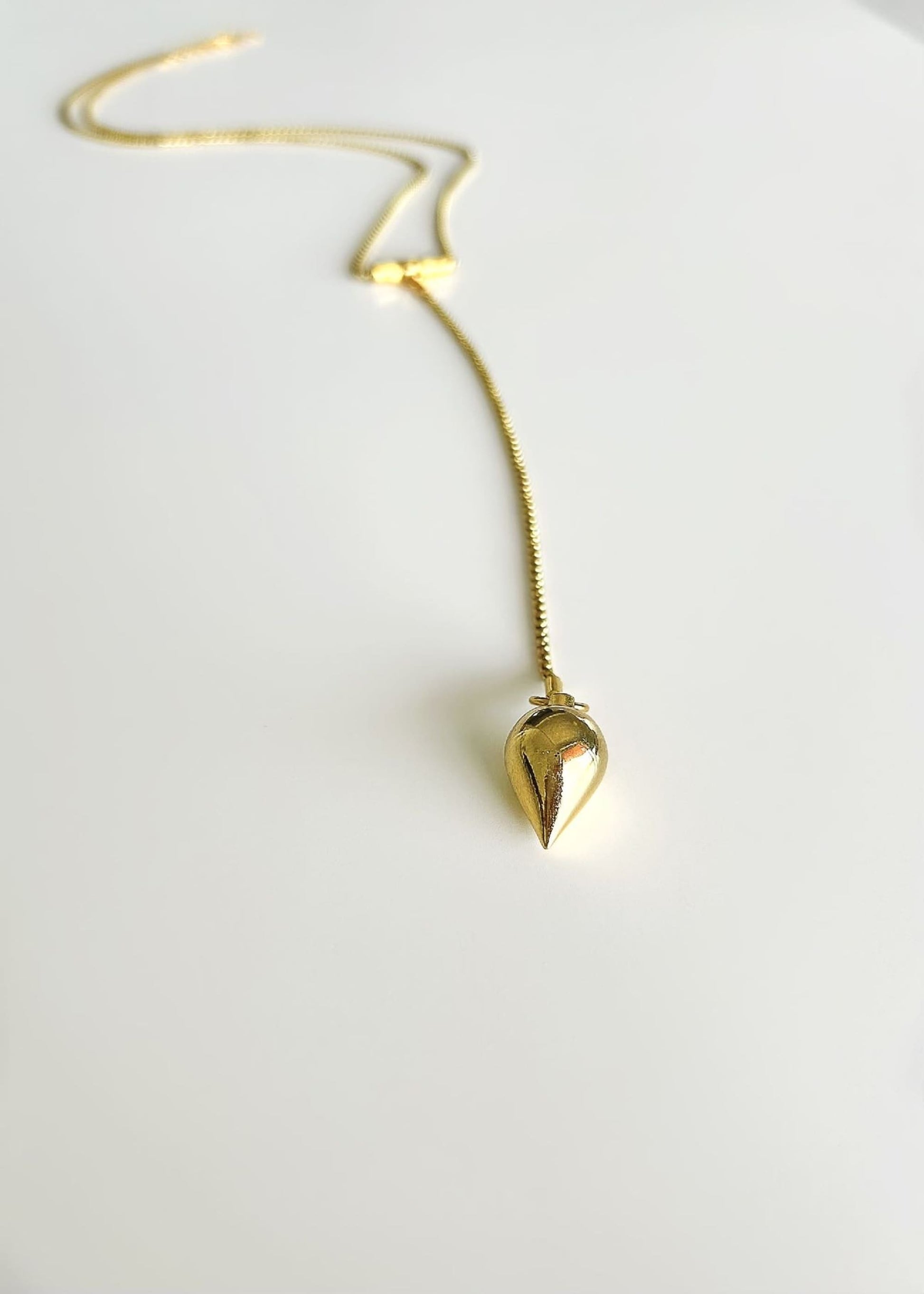 Collar, en forma de rosario, con cadena de acero y colgante en forma de péndulo.