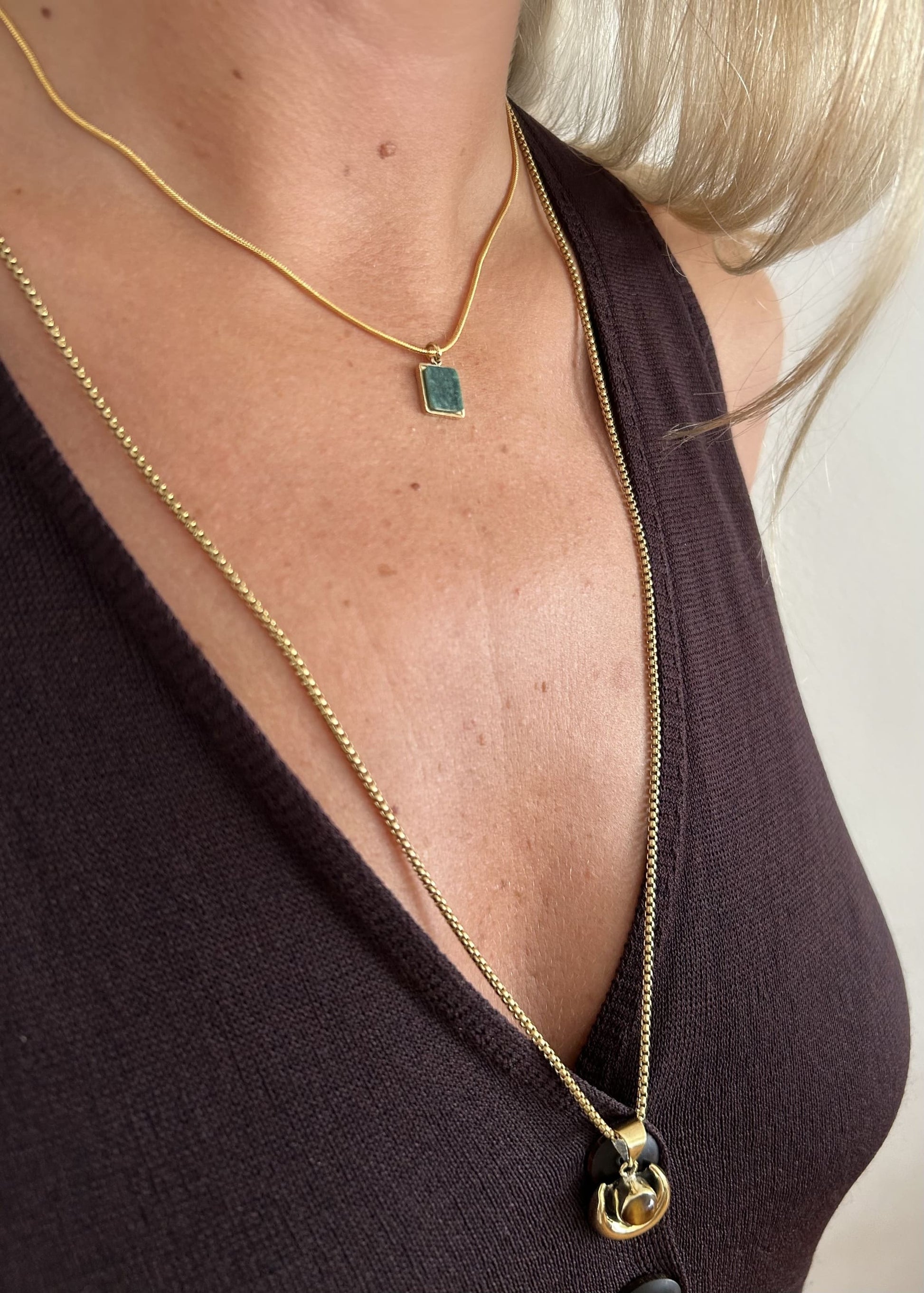 Gargantilla con cadena de serpiente en orado y colgante cuadrado con piedra natural en color verde.