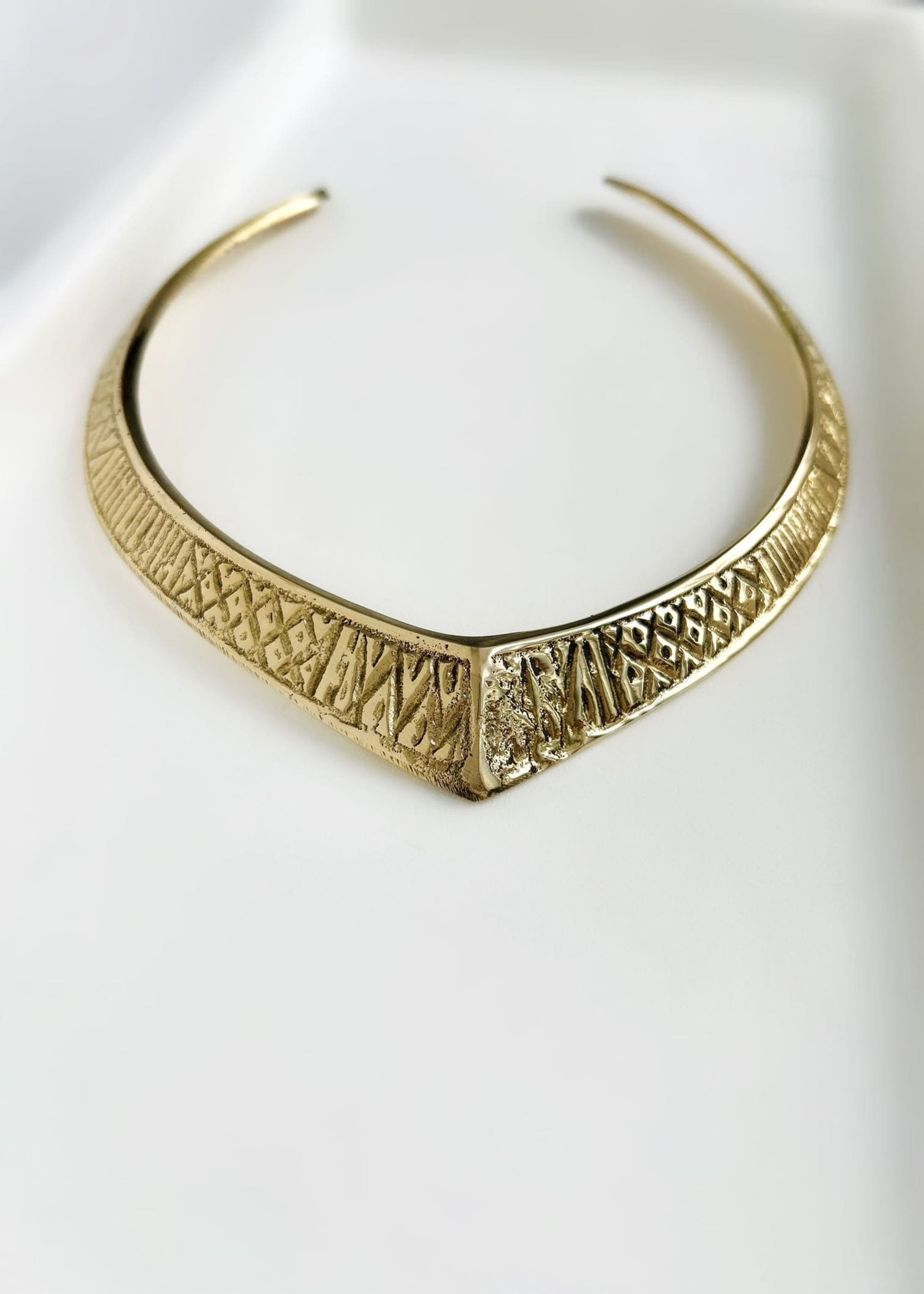 Gargantilla rígida en latón dorado labrado.