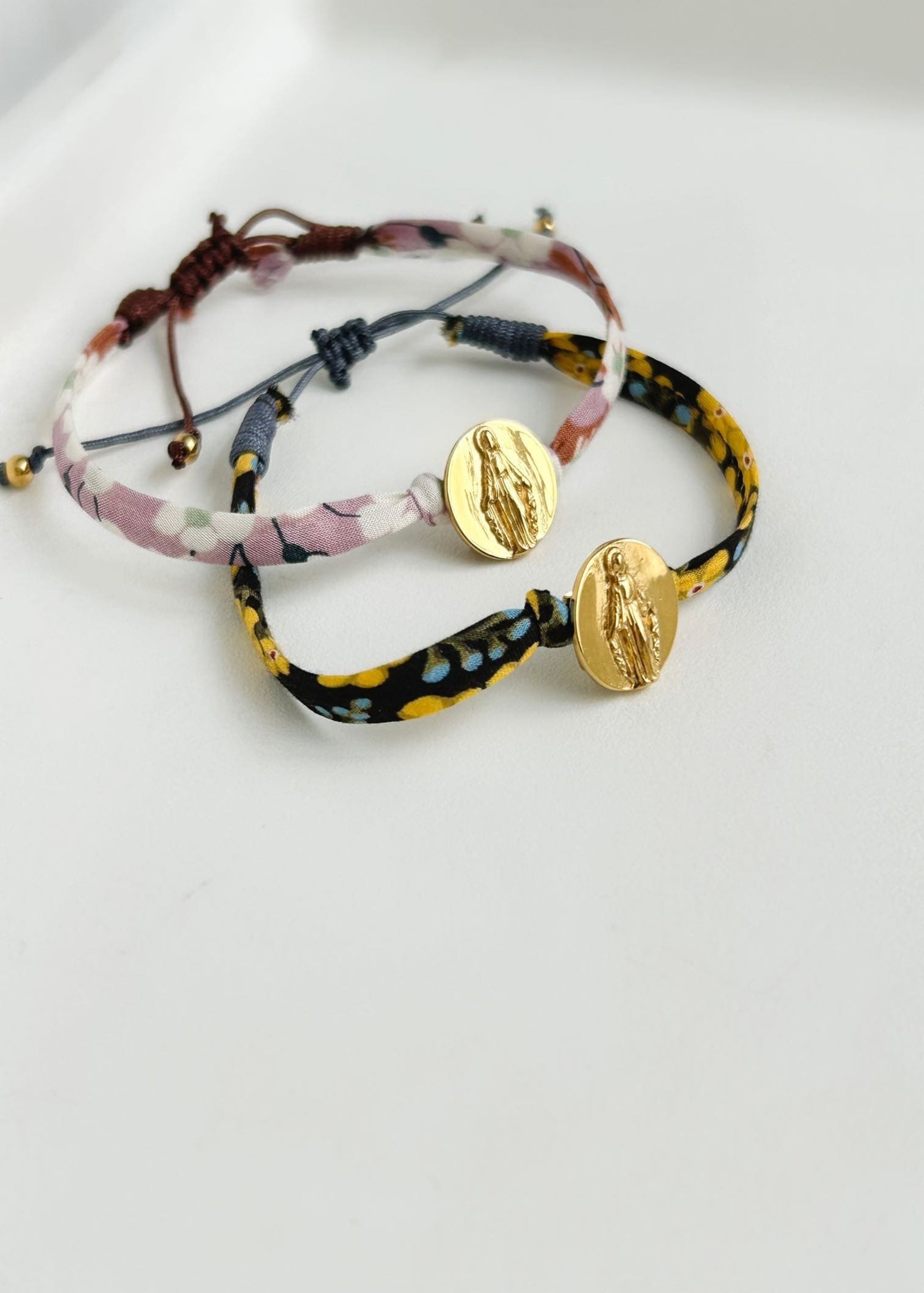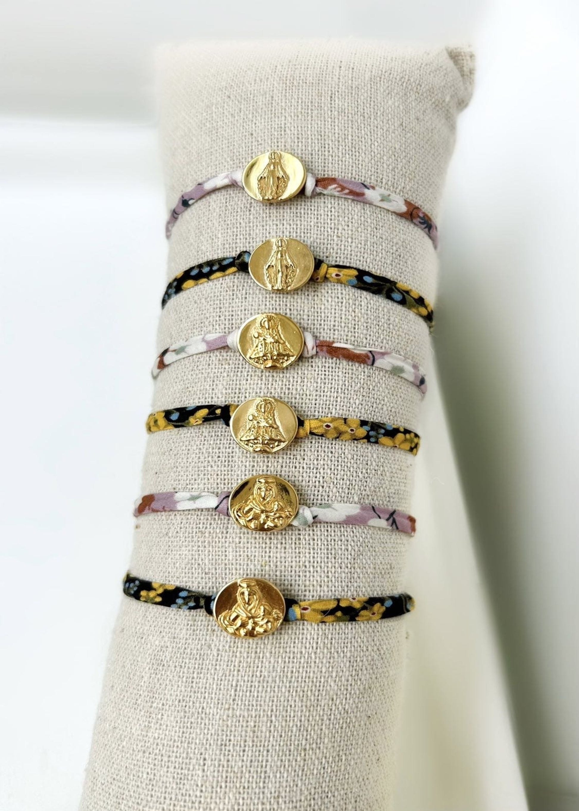 Pulsera con medalla de la Virgen Milagrosa, en acero, y con cinta de liberty.